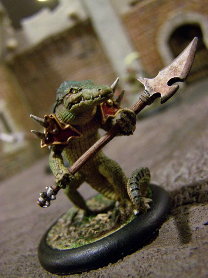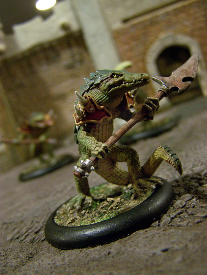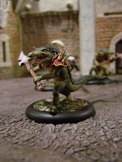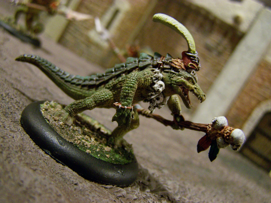 I converted these gators for the soul purpose of running them under the whip of Paingiver Task Master. I pulled the shoulder armor from my Praetorian Karax, to give the gator that Skorne feel. I could not let the leader go without some enhancements. I took the helmet from a GW wood elf dragon rider that had. It gives the leader that pimped out look.