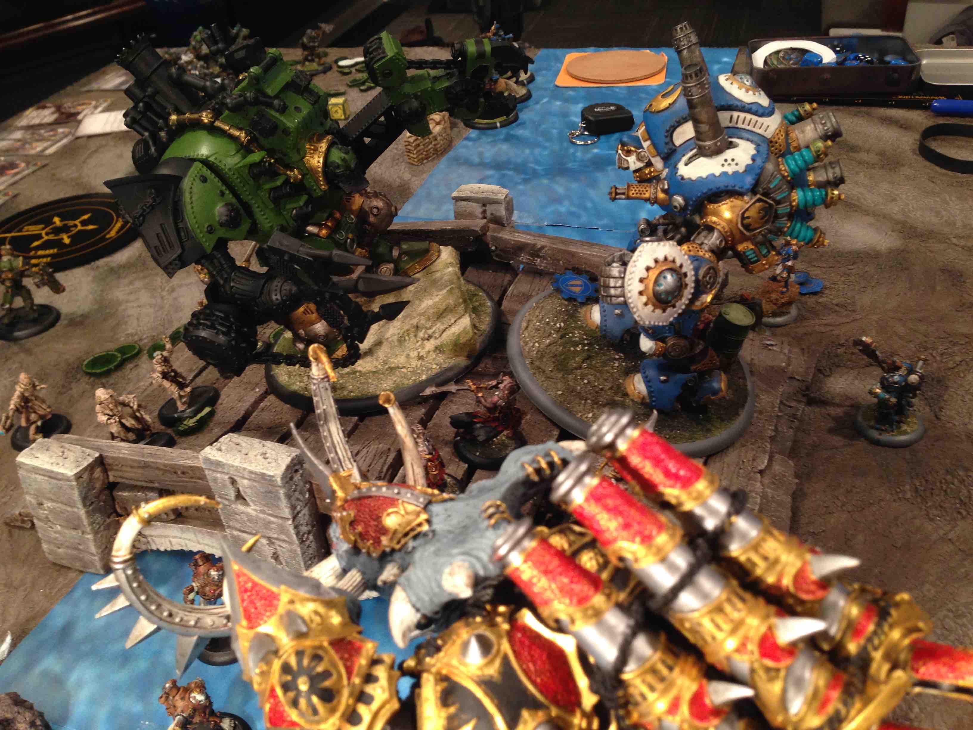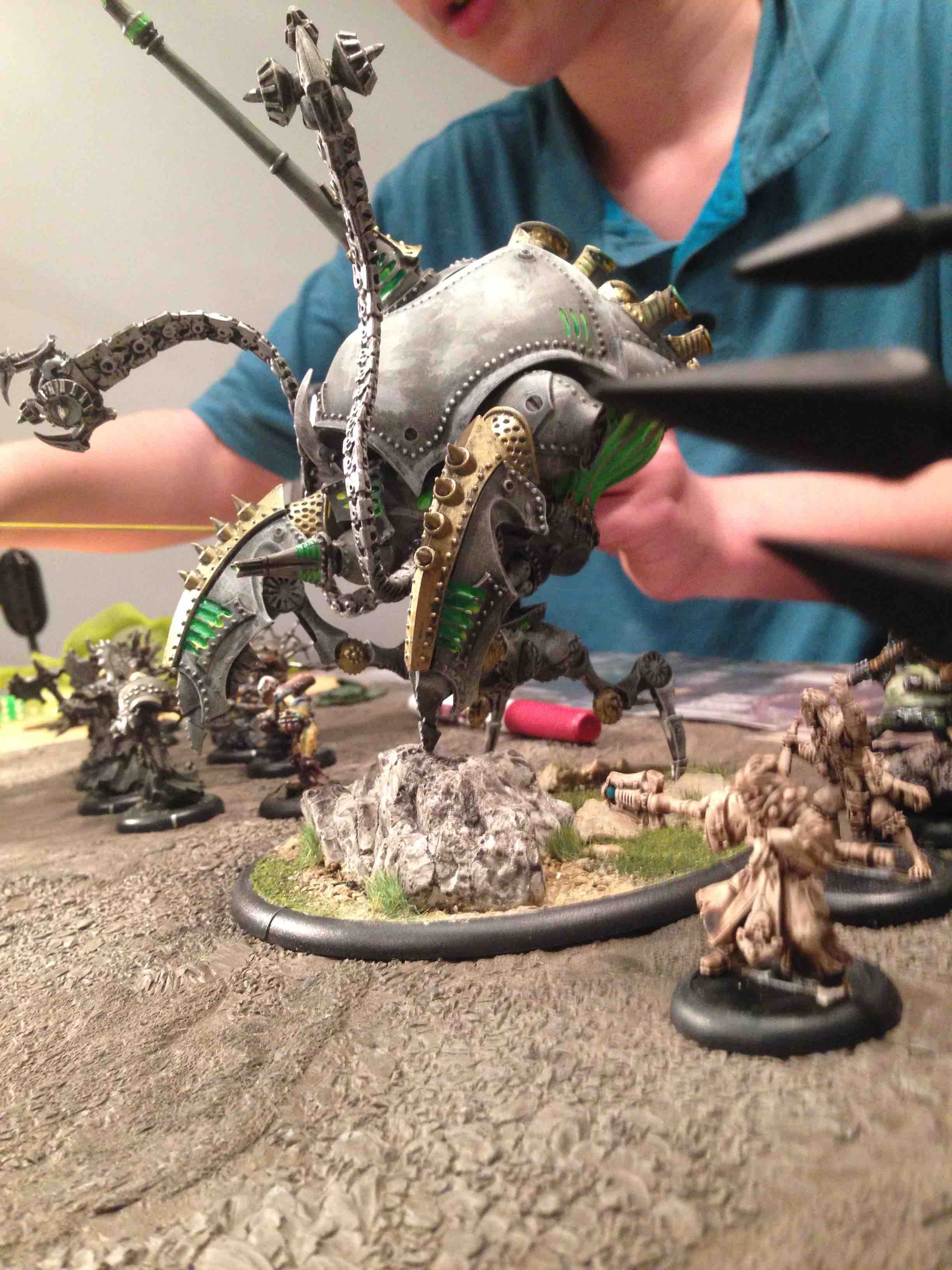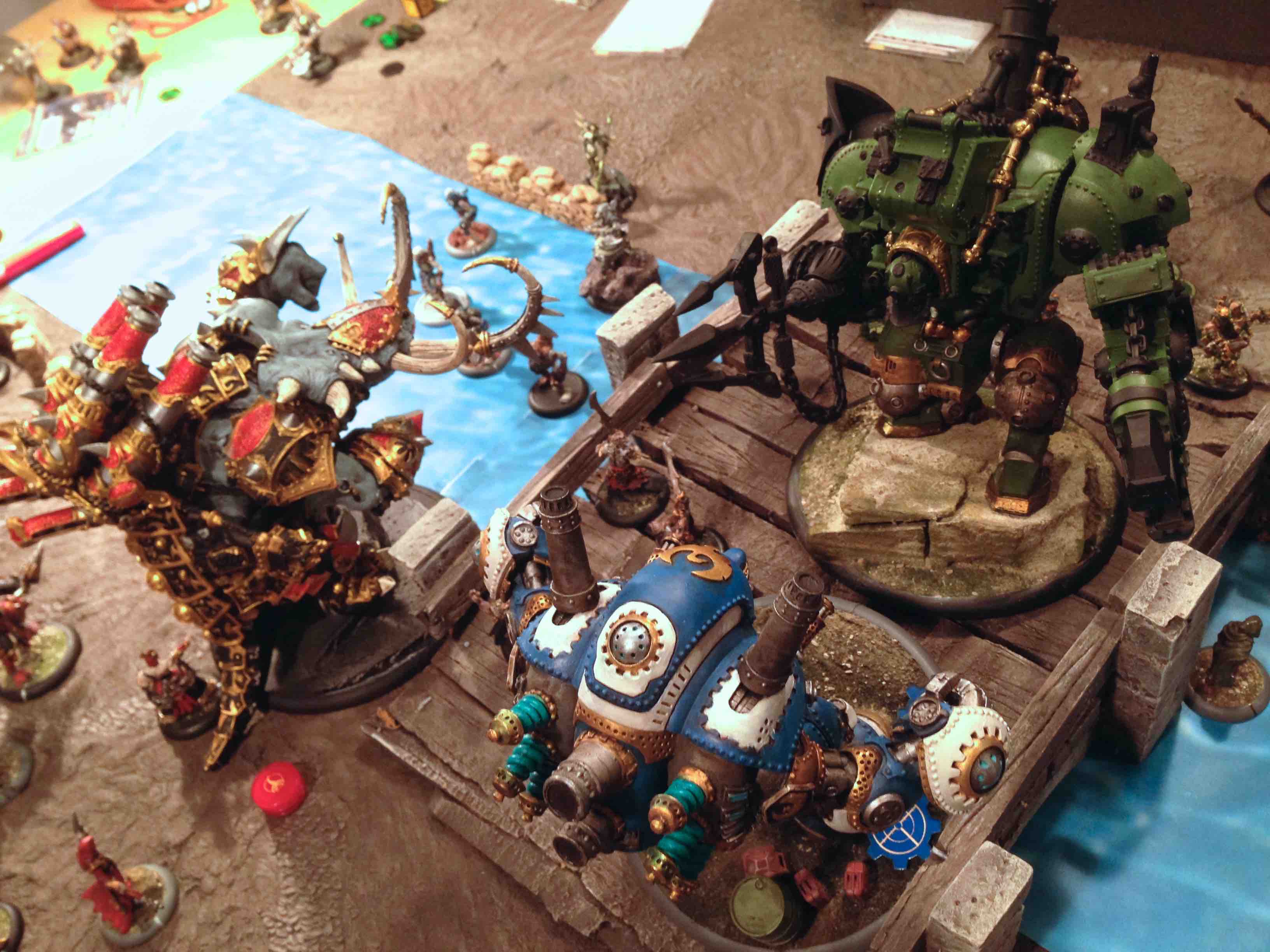 War Witch Deneghra with Kraken – Cryx Colossal and Drake MacBain with Galleon – Mercenary Colossal vs Lord Arbiter Hexeris with Mammoth – Skorne Gargantuan and Major Victoria Haley with Stormwall – Cygnar Colossal. Victory Lord Arbiter Hexeris and Major Victoria Haley.