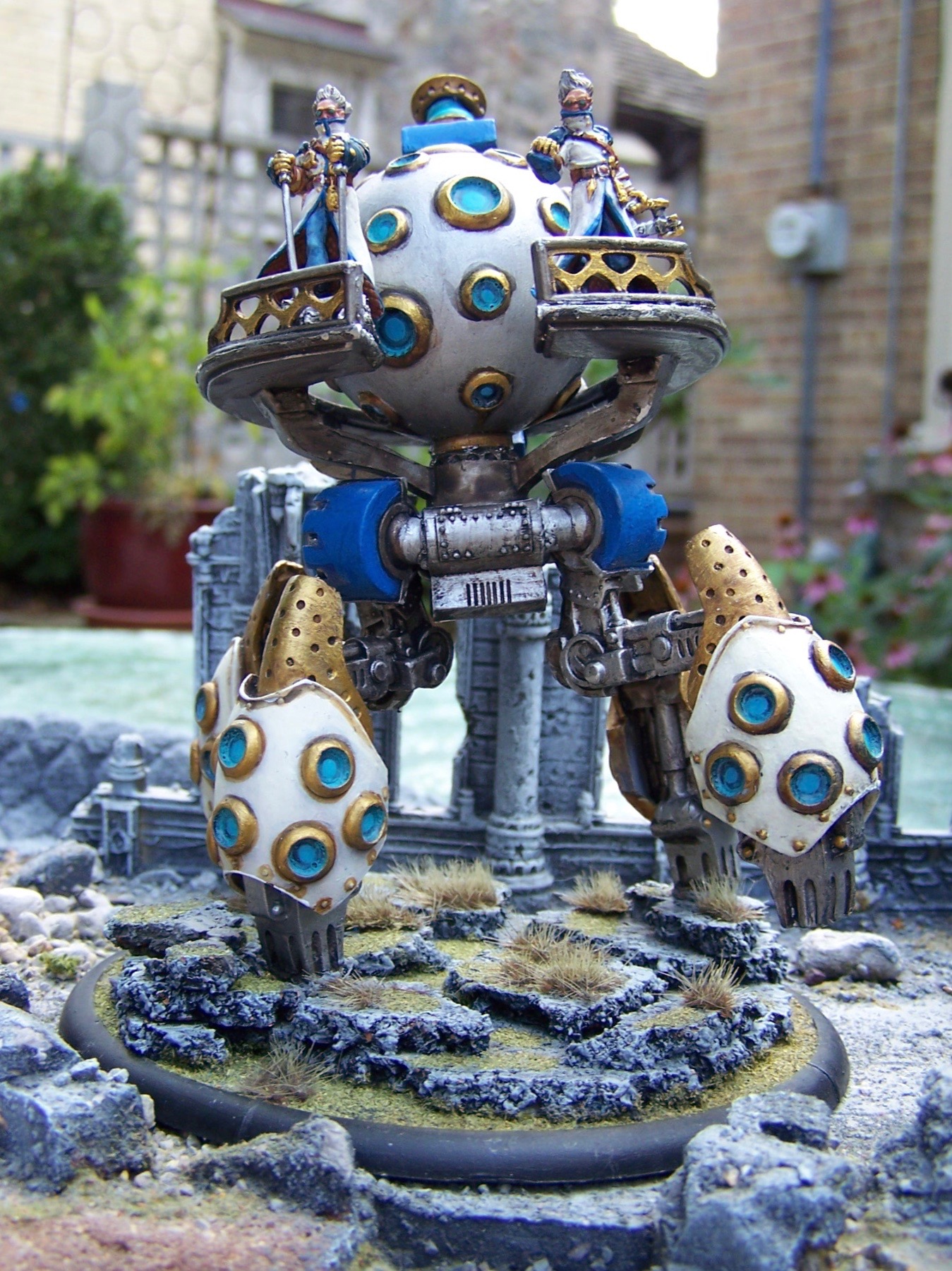 | Towering above its enemies, the lightning-wreathed Storm Strider moves across the battlefield raining voltaic death upon all who stand against Cygnar. Its lightning cannon is one of the most potent weapons in the Cygnaran arsenal and represents the pinnacle of stormsmith achievement. More devastating still is the Storm Strider’s ability to capture and store the energy of enemy attacks, adding this deadly kinetic force to its withering lightning blasts. |