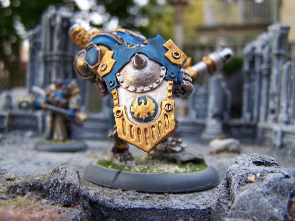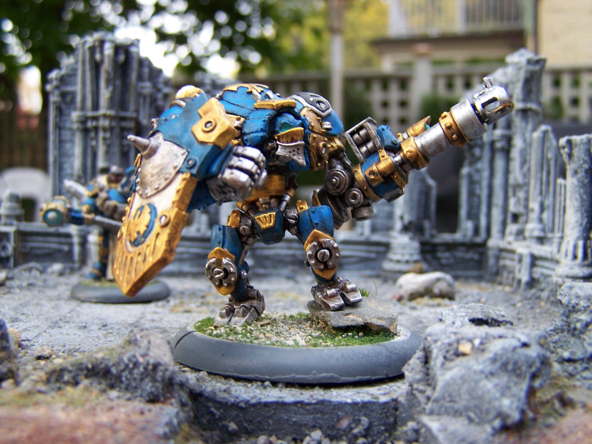 Triumph is the culmination of centuries of Cygnaran technological development. Made to the specifications of Major Markus “Siege” Brisbane, Triumph is armed with a massive cannon that can strike enemy warcasters with a sniper’s precision or rain explosive-tipped death down on the heads of opposing infantry and warjacks. Triumph is an artillerist’s dream and a nightmare to Cygnar’s foes.